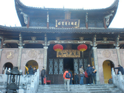 真身寶殿,俗稱(chēng)“肉身殿”,又稱(chēng)“肉身塔”,坐落在九華山神光嶺(老爺頂)上,為佛教徒朝謁九華圣地的主要場(chǎng)院所,這里因主供地藏菩薩,故與一般佛寺不同。九華山肉身殿是典型的宮殿建筑,殿高15米,門(mén)朝西南。入殿須登八十一級(jí)臺(tái)階,站在臺(tái)階之下,舉目仰望,可見(jiàn)南門(mén)廳上兩塊匾額:上額書(shū)“肉身寶殿”,下額書(shū)“東南第一山”。大殿四周回廊上方雕梁畫(huà)棟,仙鶴、麋鹿等珍禽異獸,牡丹、靈芝諸鮮花奇草。