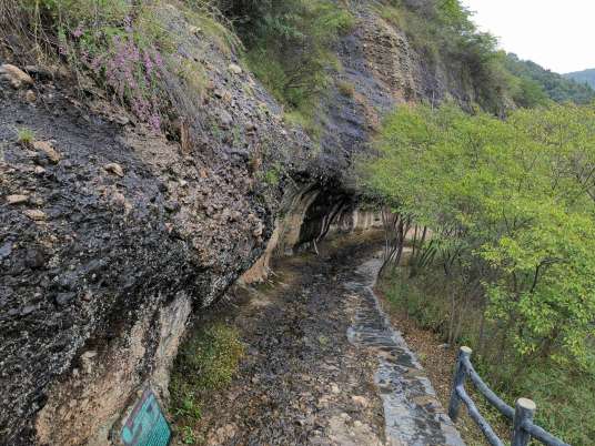 皖西大裂谷集峽谷地貌和洞穴景觀于一體,裂谷長(zhǎng)約1500米,寬數(shù)十米、高十余米,谷坡陡峭,多在80度左右,最陡處四座直立,谷深數(shù)十米、高百余米,為一陡立的“V”字形谷,大別山區(qū)所罕見。裂谷是由流水沿?cái)嗔褬?gòu)造長(zhǎng)期侵蝕下切所形成的,其西側(cè)洞穴也是因流水沿巖石構(gòu)造軟弱部位選擇性溶蝕所致。