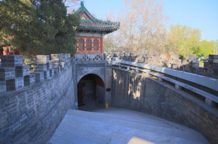 智珠殿,半月城位于瓊島東麓山腳下,座西面東與陟山橋相對(duì),建于乾隆十六年(1751年)。智珠殿建在半月城城臺(tái)上,紅墻綠瓦,四面有五個(gè)牌樓相對(duì),中軸對(duì)稱、布局別致是中國(guó)古建筑中比較少見(jiàn)的,殿內(nèi)原供奉文殊菩薩一尊。