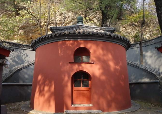 山門(mén)兩旁各有配殿二間,清水脊、石板頂,殿前各有一株古柏,院中間即為鐵瓦殿,是一座圓形的建筑,高6米,直徑近6米,殿墻刷成鐵紅色,券形門(mén)窗與大殿的圓柱形和諧相宜。攢尖式殿頂,鐵質(zhì)塔剎,頂尖由寶珠收攏,頂上自塔剎垂下六條鐵質(zhì)屋脊,將頂面均分成六個(gè)扇面形,頂面鋪蓋鐵瓦共458塊,每塊瓦長(zhǎng)0.31米,直徑0.13米,重約4公斤,總重量約1882公斤。鐵瓦大部分鑄于明代,個(gè)別是清康熙時(shí)期修繕時(shí)補(bǔ)上的。