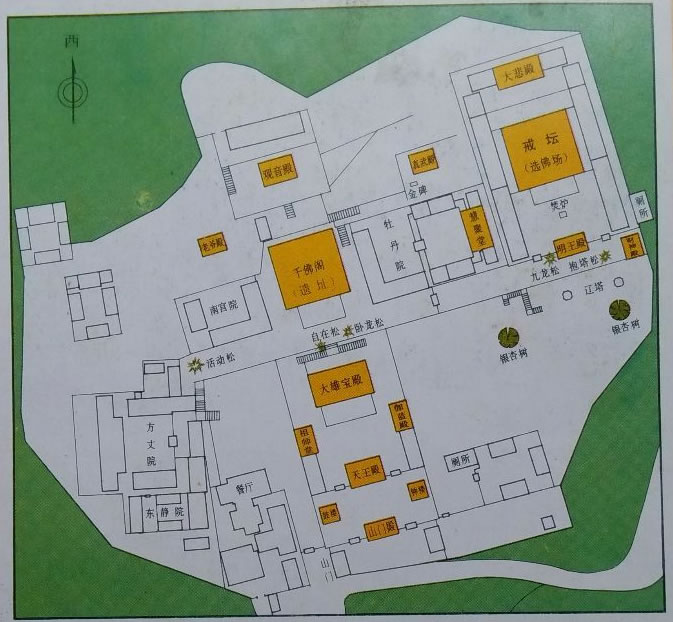寺院坐西朝東,中軸線上依次排列山門殿、鐘鼓二樓、天王殿、大雄寶殿、千佛閣(遺址)、觀音殿和戒臺(tái)殿。其中戒臺(tái)是中心建筑。殿宇依山而筑。