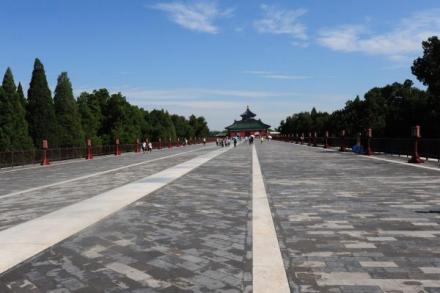 丹陛橋長(zhǎng)360米,是連通圜丘壇和祈谷壇的一條高出地面4米的大道。大道中部下有東西向券洞通道,故名橋,是北京最古老的“立交橋”。橋面寬30米,中間石板大路為“神路”,供天帝專(zhuān)用;東側(cè)磚砌路面稱(chēng)“御路”供皇帝專(zhuān)用,陪祀王公大臣只能在西側(cè)的“王路”上行走,上下進(jìn)退等級(jí)分明。丹陛橋北高南低,北行令人步步登高,如臨天庭。