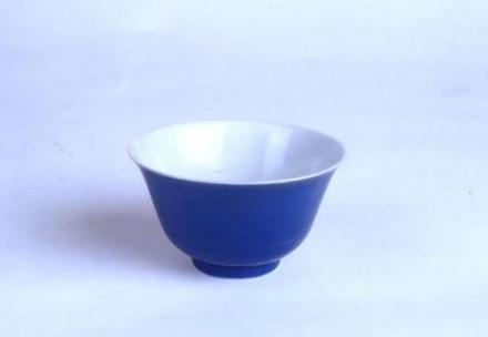 瓷質(zhì)。撇口,弧腹,深腹平底,圈足。器身外施祭藍(lán)釉,內(nèi)施白釉。純素。底書(shū)青花“大清光緒年制”六字雙行楷書(shū)款。