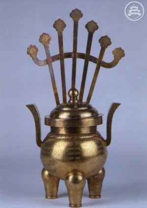 鍍金銀質(zhì)。體圓,直口平唇,短頸,鼓腹,兩側(cè)飾天官耳,腹下三足。爐口雷紋,通體刻八卦云鶴紋。爐蓋圓形,疊二層,上層鏤空乾、兌、震紋,后有香靠具缺刻。香靠具一付,從爐體內(nèi)壁靠具槽處插入爐內(nèi)。香靠具七出,鶴紋如意云頭,中間香插有圓框,以插圓形柱香。爐底陰刻楷書(shū)款“恒利銀號(hào)造京平足紋,重一百九十一兩五錢(qián),鍍金十五兩三錢(qián)”“光緒癸卯年制”。