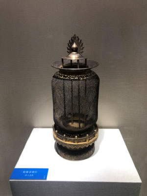 鍍金銀質(zhì)。由燈罩、燈座兩部分組成,整體圓柱籠形,罩、座可拆分。圓須彌座,浮雕卷草紋、蓮瓣紋,座臺(tái)欄桿上下鏤刻如意云紋欄板、掛落。座臺(tái)中心4柱燈提,貫穿于燈罩內(nèi),柱頂三叉火焰珠。燈罩用軟金絲編織成鏤空網(wǎng)狀圓筒籠形,上下收口,敞檐鏤刻纏枝蓮寶相花紋。底部陰刻楷書(shū)款,右為打造銀號(hào)和重量“恒利銀號(hào)造京平足紋,重二百兩一錢(qián)”,中為六字雙行“光緒癸卯年制”,左為鍍金重量“鍍金十六兩”。每燈重量和鍍金重量不同,刻款不同,因此每件皆為孤品。