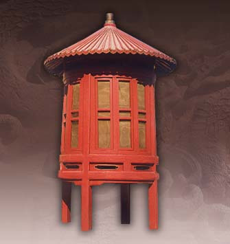 清末造。通高36.5厘米,檐方28厘米,足方20.6厘米。方形,四邊銅框,凹面玻璃心,一面為門(mén),銅框兩側(cè)、底云花裝飾,挑形活頁(yè)二,桃形吊環(huán),底邊有花紋,蓋頂穹隆形,四脊間飾四縷空金錢(qián)眼紋,頂飾圓尖鈕。陳設(shè)于祭壇正位前和臺(tái)階上,用于祭祀時(shí)照明。
