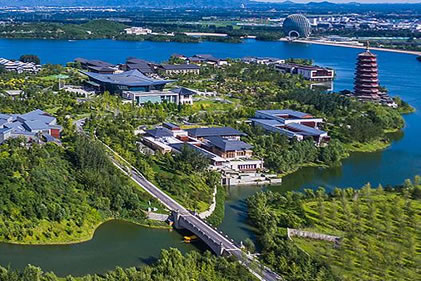 雁棲島上 核心是 雁棲湖國際會議中心。服務于大型會議。建筑主體是 “漢唐飛揚”,前面是夏園?偨ㄖ娣e4.2萬平方米,大小會議室、餐廳20余間,可以同時滿足近千人舉行會議和用餐。會議中心建筑內部以H型為布局,功能核心區(qū)由位于一層的宴會廳——“鴻雁廳”和位于二層的會議大廳——“集賢廳”組成,兩側為貴賓大廳、休息區(qū)、大小會議室、包間等功能空間,宴會廳南側設室外宴會草坪,可以舉辦室外酒會等活動。