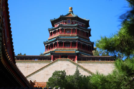 佛香閣位于在萬壽山前山中央部位的山腰,建筑在一個高21米的方形臺基上,是一座八面三層四重檐的建筑;閣高41米,閣內(nèi)有8根巨大鐵梨木擎天柱,結(jié)構(gòu)復(fù)雜,為古典建筑精品。原閣咸豐十年(1860年)被英法聯(lián)軍燒毀后,光緒十七年(1891年)花了78萬兩銀子重建,光緒二十年(1894年)竣工,是頤和園里最大的工程。閣內(nèi)供奉著“接引佛”,供皇室在此燒香。