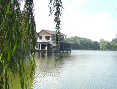 問月樓:為一水榭,幽雅別致。湖西部有“報(bào)恩樓”、“紫竹垂釣”;南部有“澄碧山房”、“兒童樂園”。
