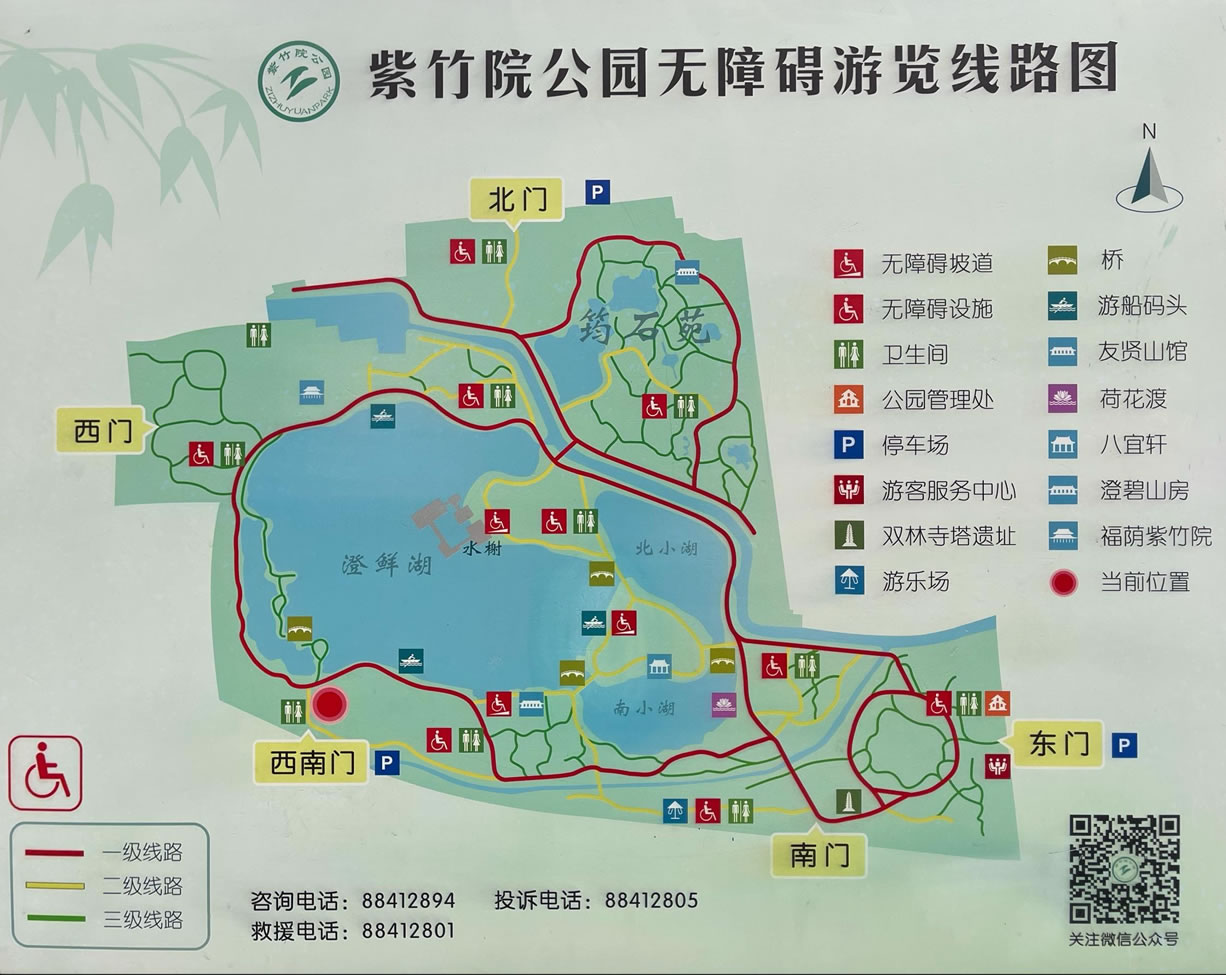 紫竹院公園占地47.35萬平方米,其中水面18.9萬平方米,水面約占三分之一。南長河、雙紫渠穿園而過,形成“三湖兩島一堤”的基本格局,是一座翠涌芳島,篁映碧波,以竹取勝,以竹為景的自然山水園林。分為綠毯詩韻、青蓮島、明月島、筠石苑等景一片蓄水湖,公元三世紀(jì)時(shí),這里是高梁河的發(fā)源地,系燕京水源之一。明代萬歷五年(1577年),在湖北岸興建紫竹院廟宇,為萬壽寺的下院。全園占地47.35公頃,其中水面占18.9公頃。園中有大小湖泊三個(gè),兩座小島,五座拱橋把湖、島、岸連在一起,橋、廊、亭、榭,點(diǎn)綴其間,紫竹院公園以竹景取勝。過去傳說觀音菩薩居住在南海紫竹林,這里一建有供奉觀音的寺廟而得名。共栽有10余種竹子,16萬余株,成為一座以水景為主,以竹景取勝,深具江南園林特色的大型公園。 1999年開通的京城到頤和園水上旅游線,這里是必經(jīng)之路。 健身旅游賞景的好地方。