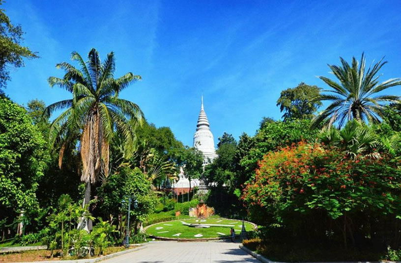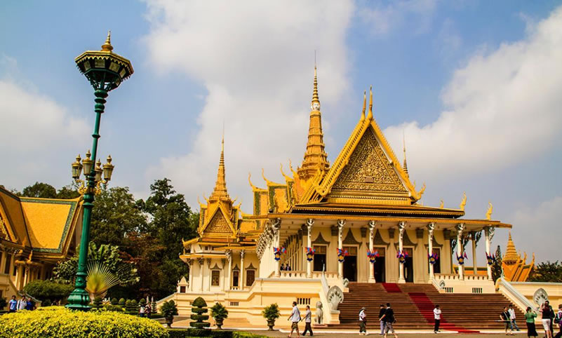 金邊王宮 金邊王宮(RoyalPalace)也稱四臂灣大王宮,因位于上湄公河、洞里薩河、下湄公河與巴薩河的交匯處而得名,是諾羅敦國王于1866—1870年建造的。王宮為長方形,長435米,寬402米,外有城墻。王宮的建筑具有高棉傳統(tǒng)建筑風格和宗教色彩,宮殿均有尖塔,代表繁榮;殿身涂以黃、白兩色,黃色代表佛教,白色代表婆羅門教。王宮最初為木結構,后改建為水泥結構,但保持了原來的風貌。王宮內(nèi)主要建筑有:銀閣、金鑾殿、波佳尼閣、凱瑪靈宮、月光樓。
