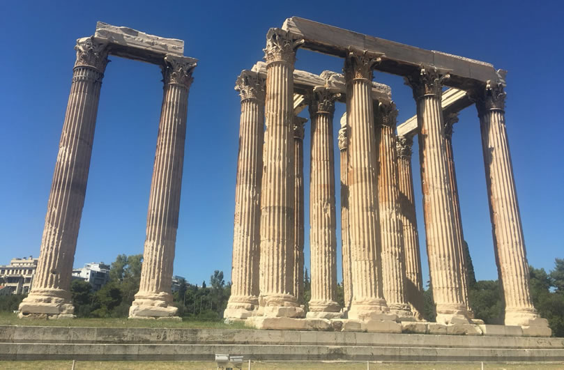 宙斯神廟 宙斯神廟位于希臘雅典衛(wèi)城東南面,是為了祭祀宙斯而建的,也是古希臘最大的神廟。宙斯神廟建于公元前470年,于公元前456年完工,由建筑師Libon設(shè)計(jì),宙斯神像則由雕刻家菲狄亞斯負(fù)責(zé)。直到公元前86年,羅馬指揮官蘇拉(Sulla)攻占雅典,破壞了尚未完成的建筑,將一部分石柱和其他建材拆下來(lái)之后,運(yùn)到羅馬。直到今天,在羅馬市中心的古羅馬廣場(chǎng)遺址上,還能看見(jiàn)它們。宙斯廟尤以象牙和黃金的塑像而聞名于世。 宙斯神廟是伊奧尼亞風(fēng)格的建筑,后來(lái)改用了科林斯式石柱風(fēng)格,而且一概使用大理石。整個(gè)建筑坐落在一塊205米長(zhǎng),130米寬的地基上,神廟本身長(zhǎng)107.75米,寬41米,共有104根科林斯柱。每根石柱高達(dá)17.25米,頂端直徑達(dá)1.3米,約計(jì)用大理石1.55萬(wàn)噸。和眾多的古希臘神廟一樣,宙斯神廟也遭受嚴(yán)重的破壞,104根柱子中僅存13根。宙斯神廟和哈德良拱門(mén)隔路相望,宙斯神廟位于路南,而哈德良拱門(mén)則位于路北,這兩座建筑都是由距今1900多年前的羅馬帝國(guó)國(guó)王哈德良時(shí)期修建的。我們已經(jīng)無(wú)法看到宙斯神廟和哈德良拱門(mén)的原始形態(tài),只能通過(guò)斷壁殘?jiān)珌?lái)回憶當(dāng)時(shí)的輝煌。