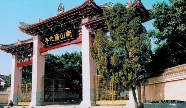 南山廣化寺:座落在城南鳳凰山。現(xiàn)行建筑群是清光緒初年依舊制重修的,從20世紀80年代開始,進行了大規(guī)模的擴建。山門照壁上有中國佛教會已故會長趙樸初題寫的“莊嚴國土,利樂有情”。廣化寺占地3.2萬多平方米,建筑物面積1.7萬平方米。踏入山門,沿著中軸線建筑拾級而上,全長385米。依次是照壁、牌坊、山門、放生池、彌勒殿(天王殿)、大雄寶殿、法堂(上為藏經(jīng)閣)、臥佛殿(下為祖堂);兩側(cè)翼建有寬敞的石柱廊廡,東側(cè)次第為東羅漢殿、鐘樓、五觀堂、伽藍殿、尊客堂、水云鄉(xiāng)、圓通門、溪聲閣;西側(cè)次第為西羅漢殿、鼓樓、學戒堂、祖師殿、凈行堂(念佛堂)、煙霞窟、方丈室、看山樓。寺后東西兩角的最高處,分別聳立著觀音閣和小南山。南山上有幾十株不知年代的蒼松翠柏。