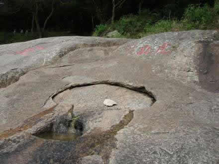 “虎乳泉”旁有“孔泉”石刻。泉眼上下皆石,上石如殼,下石如砥,中坼有孔竅,泉從隙縫里流出,注入一方形石孔中。上有呂道人題刻“虎乳”和宋朱熹撰寫的“源頭活水”石刻。“虎乳泉”長(zhǎng)年不涸,游人耳貼巖石,可聞其巖下傳出“咕咚”的陣陣響聲。