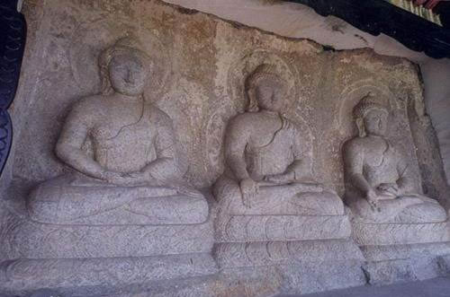 三世佛并排結(jié)咖跌坐于仰覆蓮花座上,主像通高約2.5米,左右二像稍低。佛像保存完好,皆為土蕃式樣:佛發(fā)螺鬢,上置寶嚴(yán)。面相上寬下窄,雙耳垂肩,肩寬腰細(xì),均著袒右肩袈,并以袈裟一角搭于左肩上。衣紋用凸雕線條表示,雖歷經(jīng)滄桑而線條依然明顯。石像均有圓形頭光及身光。中尊釋迦像,為現(xiàn)代佛,主管現(xiàn)代的世界,其造像作觸地印之魔相,一手向下?lián)岬兀皇窒蛏。左尊稱為藥師佛,即過去佛,主管過去的世界。他也是一手向下,一手向上,只是左掌托缽。右尊叫彌陀佛,是未來佛,作施定印之禪定相,即雙手交疊置于腹部。
