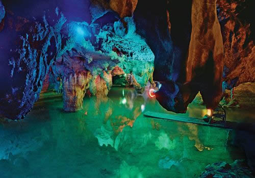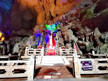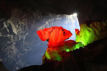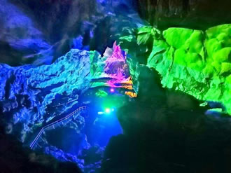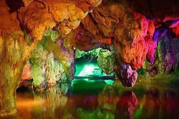 自藏禾洞沿石階而上,便到了雷公洞。洞內石筍和石鐘乳十分發(fā)達,因巖石含有碳酸鈣、鐵質、方解石、石英等成分,整個洞廳色彩斑斕。洞底暗河水聲隆隆,猶如雷鳴,故而得名。傳說天上雷神每年都要下來巡洞一次,在這里休息。