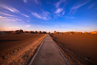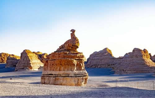 柱狀雅丹,是形態(tài)最為獨特的柱狀雅丹體。上部的粘土層難風(fēng)化,而下部的沙質(zhì)層卻易于風(fēng)化。這種差異形成了頂部粗大的塊體高懸于下部細(xì)小的柱體之上,在形態(tài)上似天外來客眺望凝思,吸引著游人去探索它的奧秘。