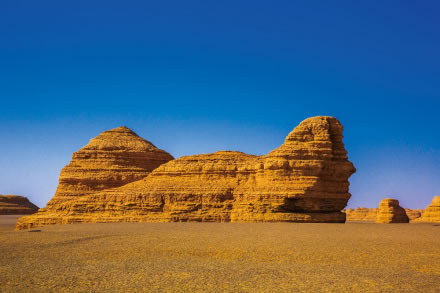 墻狀雅丹,屬于墻狀雅丹體向塔狀雅丹體的過渡類型。雅丹體由沙質(zhì)和泥質(zhì)沉積物組成,差異侵蝕風(fēng)化作用形成了凹凸不平的表面。遠(yuǎn)遠(yuǎn)望去,酷似埃及的“獅身人面像”,充分展示了大自然的巧奪天工。
