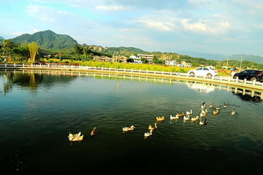 臺灣度假村位于長潭旅游區(qū)入口處的虎形山,占地面積218畝,主要開發(fā)廣場、朝圣區(qū)、游樂園、賓館、別墅、展覽館、科技城、美食一條街、農(nóng)業(yè)觀光和苗圃等項目。為一富娛樂性、知識性、觀賞性之休閑場所。1998年11月動工,1999年,度假村建成戲水樂園、滑草坪、親子園地、世界蝴蝶館,此館擁有全國最多的蝴蝶種類,為廣東省最大最具規(guī)模的觀賞樂園。此外還成功引種臺灣名優(yōu)稀特水果火龍果。臺灣度假村風(fēng)光旖旎,富有詩情畫意,依山構(gòu)筑的山門別具一格,其景觀廣場、游樂園、朝圣區(qū)、科技城錯落在山水、綠樹之間,水色塋潔,光可照人。