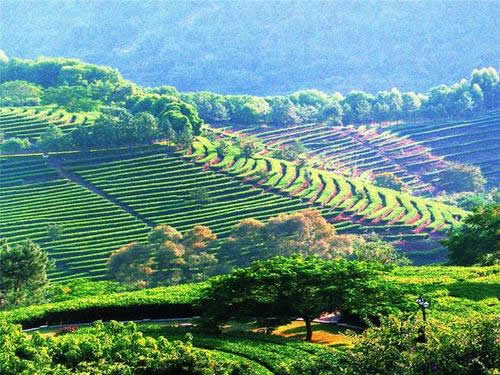 雁南飛茶田是飽蘸著祖國茶文化,在青山綠水間濃墨重彩揮灑而就的融茶葉生產(chǎn)、加工與旅游、度假于一體的山區(qū)“三高農(nóng)業(yè)”、“生態(tài)農(nóng)業(yè)”、“旅游農(nóng)業(yè)”的開放型旅游景區(qū),被譽(yù)為“現(xiàn)代農(nóng)業(yè)開發(fā)的成功范例”,梅州“三高農(nóng)業(yè)”開展的一個樣板和典范。雁南飛茶田在茶葉種植的同時結(jié)合了果樹的種植和園林綠化,大片的茶樹與龍眼、荔枝、芒果、枇杷等南國佳果、各式園林綠化景點相隔其中競相媲美。雁南飛茶田在科學(xué)種植的同時,采用傳統(tǒng)工藝結(jié)合現(xiàn)代高新技術(shù),精制出有獨特自然香型的雁南飛高級系列茗茶,并賦于濃厚的文化內(nèi)涵和高附加值,創(chuàng)造了名牌精品。雁南飛茗茶主要有:金單叢烏龍茶、自然香烏龍茶、金桂蘭烏龍茶、人參烏龍茶、金觀音烏龍茶、桂花烏龍茶,此外還有特制的茉莉花綠茶、映山紅紅茶等品種,適合不同品味的人士品茗。
