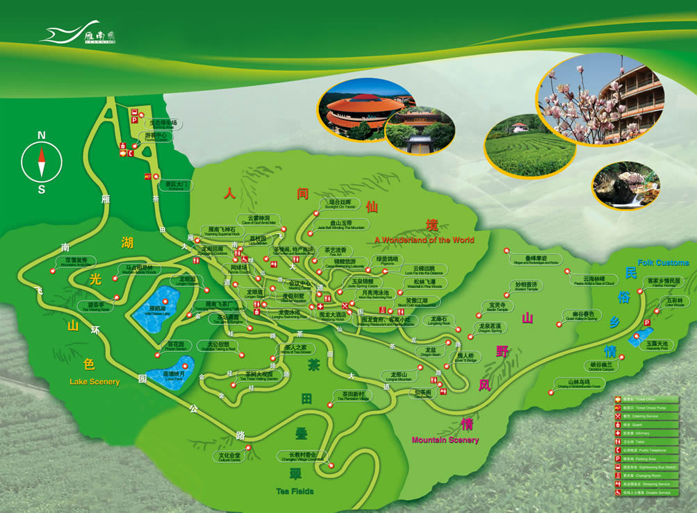 主要景點和設(shè)施有茶田、果園、望茶亭、茶情閣、茶藝館、美食街、生態(tài)谷、游泳池、網(wǎng)球場、人工湖、山水瀑布、游客中心、會議中心、圍龍食府、山莊別墅、圍龍大酒店、茶花大觀園等。