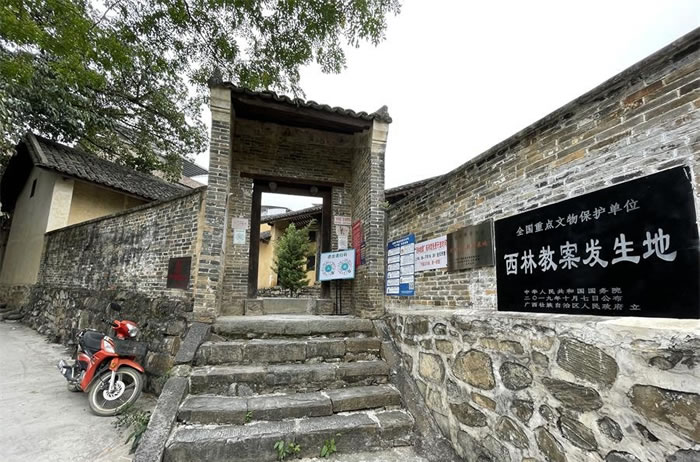 位于現(xiàn)田林縣定安鎮(zhèn),1852年起,法國侵略者派天主教神甫馬賴潛到田林縣定安鎮(zhèn)一帶,以傳教為名進行非法活動。馬賴等人目無官府,肆意橫行。1856年2月,西林縣知事張鳴風(fēng)順應(yīng)民心,依法將馬賴及其忠實信徒白小滿、曹貴(女)等三人在定安教場斬首示眾,這就是當(dāng)時震驚中外的“西林教案”事件,也稱馬神甫事件。法國拿破侖三世以此為借口,與英國侵略者串通一氣,向中國發(fā)動第二次鴉片戰(zhàn)爭,并強迫清政府在西林縣城定安鎮(zhèn)建起規(guī)模較大的天主教堂,定安鎮(zhèn)從此成為法國傳教士宣傳洋教的一個據(jù)點。 鑒于“西林教案”曾經(jīng)是近代中國人民反洋教斗爭高潮的前奏的特殊歷史意義,1994年自治區(qū)政府將其列為文物保護單位。