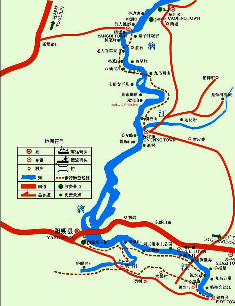 在畫山之南,有一塊黃色巖石,寬數(shù)丈,像一塊黃布平鋪江底,這里因名黃布,灘名黃布灘。2000年中國人民銀行發(fā)行了第五套人民幣,其中20元紙幣背面的漓江風光就是黃布倒影。