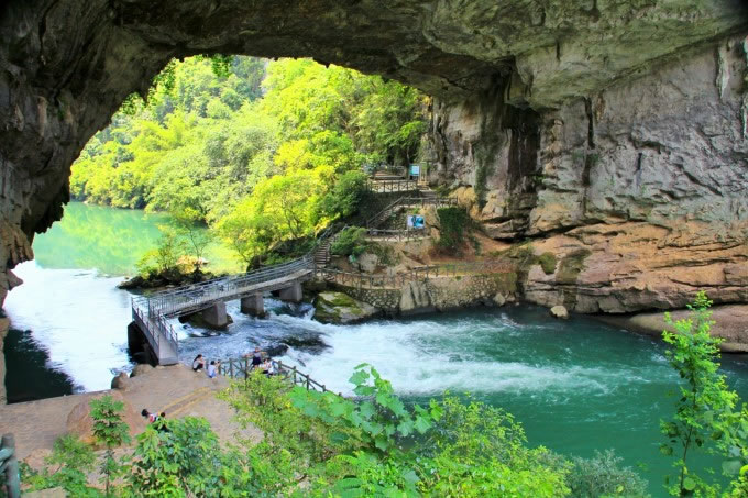 天生橋橋洞拱高35米,橋面長寬度各40米。這里有一個(gè)美麗動人的傳說,以前這里沒有橋,過河極為不便,遠(yuǎn)在洛陽的魯班師傅知道后,揮動他手中的板斧一揮而就,當(dāng)?shù)氐睦习傩諡楦兄x他,就送了三顆香桃給他,當(dāng)時(shí)正值陽春三月,桃紅柳綠,魯班師傅就把此橋稱之為“香橋”。