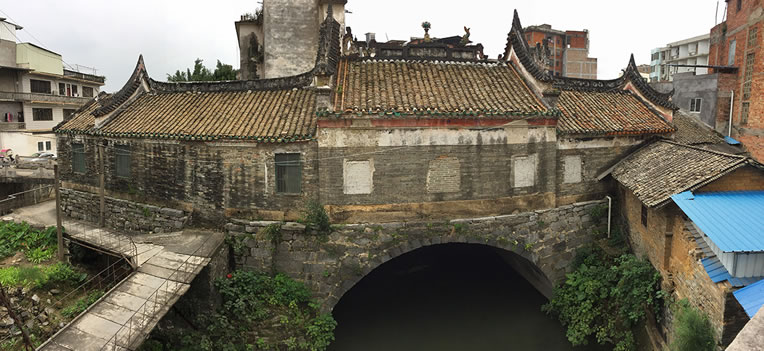 登龍橋在西河流向圭江的入口處。據(jù)資料記載,該橋始建于宋元年,全長36.3米,拱跨10米,高5.5米,寬13.5米。橋面一邊為橋的通道,中間建風(fēng)雨亭,為歇山頂磚木結(jié)構(gòu);一邊建殿堂,青磚砌墻,青瓦覆蓋,硬山頂磚木結(jié)構(gòu)。頂部磚砌灰雕花脊,兩端飾鰲魚,中間為火球。殿內(nèi)墻端繪飾古壁畫,園木柱作頂柱。橋東牌坊上刻著“登龍橋”三個大字,整座建筑風(fēng)格獨(dú)特,莊重樸實(shí)。為北流八景之“龍橋夜月”所在。