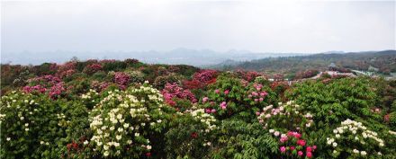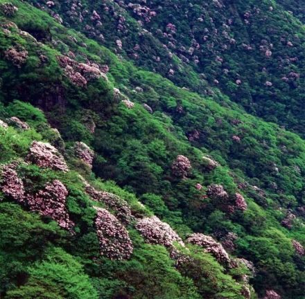 百里杜鵑林帶呈環(huán)狀分布,延綿50余公里,寬約1~3公里。有馬纓杜鵑、大白花杜鵑、水紅杜鵑、露珠杜鵑等41個品種,占世界杜鵑花5個亞屬中的全部;ㄉ鄻,絢爛生輝。每年3月中下旬到4月底次第開放,百里花山色彩繽紛,猶如廣袤的錦緞華章鋪山蓋嶺,百態(tài)千姿。被譽為“世界上最大的天然花園”。