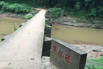 雙龍橋位于丙安鄉(xiāng)丙安村正安組一條河溝入赤水河的河口,始建于清代,面積約120平方米。雙龍橋東西走向,橋長(zhǎng)368米,寬1.7米,水面至橋面高3.2米,河中有九礅,礅寬3米,橋面分為九段,每段均為長(zhǎng)4米,寬0.85米,厚0.5米的條石鋪砌,中間兩礅鑿有一雌一雄兩條龍昂首向上流方向,龍頭高出橋面1.1米,橋中間另外三墩上有被破壞的雕刻痕跡,據(jù)附近居民講是獅子造型,文革期間被打破丟棄河中,兩端橋長(zhǎng)14.4米,東端橋長(zhǎng)3米。