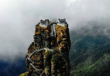 新金頂海拔2336米,垂直高差達(dá)百米,是三座金頂中最險(xiǎn)的一座。晨間經(jīng)常被紅云瑞氣圍繞,因此也被稱為紅云金頂,諧音“鴻運(yùn)金頂”,有鴻運(yùn)當(dāng)頭的的寓意。新金頂上半部分被“金刀峽”隔成兩座孤峰——南面建有釋迦殿,供奉釋迦佛;北面建有彌勒殿,供奉彌勒佛。中間由天橋連接,狀若飛龍。紅云金頂從不同角度觀看,分別似佛手二指禪,也像生命的圖騰,因此又被稱為“天下第一峰”。