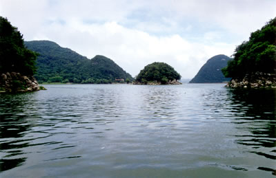 南湖的面積最大,景點也最多,南湖以洞多洞奇揚名。首先映入眼簾的,是一組奇目的山巖壁石,這是小巧瓏朗而又天然形成的“盆景山”。這里的石頭色彩特別豐富,青灰和棕黃的頁巖直插入碧水之中。大湖面逐漸狹窄,這兩邊的巖岸,如同斧劈劍削,有些游人把它呼為“小三峽”;這一片景觀石峰林立,如同到插的刀劍,給秀美的湖水增添幾許陽剛之氣,人們把它稱為“小石林”;這里的巖石,別有風(fēng)姿,它橫看不成嶺,側(cè)看不成峰,一片又一片向上堆積,有如卷幟浩繁的典籍,人們把它稱為“峭壁天書”。