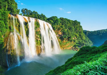 滴水灘瀑布位于黃果樹瀑布以西8公里,總高度和個體都為黃果樹瀑布群之首。這里兩山對峙,東為大坡頂,西為關索嶺,中間是深達700米的霸陵河峽谷,瀑布就掛在關索嶺大山上。滴水灘瀑布總高410米,為黃果樹瀑布的五倍,最下層134米,雄偉磅礴。