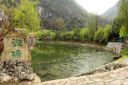 漩塘是國家級風(fēng)景名勝區(qū),在龍宮的上游。一個面積達(dá)萬余平方米的圓塘,池水不借風(fēng)力,日日夜夜、年年歲歲永不停歇地沿著順時針方向旋轉(zhuǎn)著。景象珍奇,令游客陶醉。通漩河的水流到這里便沉入地下,變?yōu)榈叵掳岛。塘面呈圓形,一年四季塘水以順時針方向,挾帶水上綠色浮萍不停地漩轉(zhuǎn),終年不息。