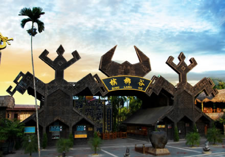 甘什嶺檳榔谷原生態(tài)黎苗文化旅游區(qū)自然景觀包括:黎族田園風光、海南島面積最大、最古老的擯柳園、多種亞熱帶古樹、山泉溪水成多級瀑布從園中穿流而形成的怪石群。人文景觀有:“奧雅宮”(黎族頭人住的房);“隆閨屋”(黎族姑娘居住和娛樂的場所)等。來海南旅游觀光客可參與黎家古老的弓騖射擊,品嘗黎家竹筒飯和黎家山茶,觀賞多姿多彩的黎族歌舞。