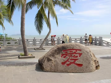 景點位于廣場的左右側(cè),在此矗立著兩塊石刻,左側(cè)的“愛”字,右側(cè)是“情定天涯海角,相愛白頭到老”。這愛情石刻圍繞著廣場中央的天涯海角星,與海面上的心形 “愛情石”遙相呼應(yīng)。