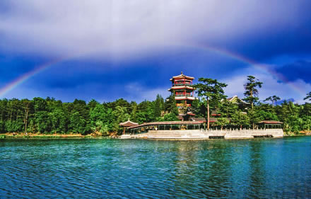 湖泊區(qū):苑景區(qū)的精華基本上在湖泊區(qū),康熙曾夸耀說,“天然風(fēng)景勝西湖”。由于洲島錯落,湖面被長堤和洲島分割成5個湖,各湖之間又有橋相通,兩岸綠樹成蔭,山莊主要的風(fēng)景建筑又都散落在湖區(qū)的周圍,因此顯得曲折有致,秀麗多姿。湖泊區(qū)位于山莊東南,面積49.6萬平方米。有大小湖泊八處,即西湖、澄湖、如意泅、上湖、下湖、銀湖、鏡湖及半月湖,統(tǒng)稱為塞湖。 湖區(qū)的風(fēng)景建筑大多是仿照江南的名勝建造的,如“煙雨樓”,是模仿浙江嘉興南湖煙雨樓的形狀修的。金山島的布局仿自江蘇鎮(zhèn)江金山。湖中的兩個島分別有兩組建筑,一組叫“如意洲”,一組叫“月色江聲”!叭缫庵蕖鄙嫌屑偕、涼亭、殿堂、廟宇、水池等建筑,布局巧妙,是風(fēng)景區(qū)的中心。“月色江聲”是由一座精致的四合院和幾座亭、堂組成。每當(dāng)月上東山的夜晚,蛟潔的月光,映照著平靜的湖水,山莊內(nèi)萬籟俱寂,只有湖水在輕拍堤岸,發(fā)出悅耳的聲音,“月色江聲”的題名便是由此而來。湖泊區(qū)集南方園林之秀和北方園林之雄,將江南園林的景觀移植到塞外。區(qū)內(nèi)湖泊總稱“塞湖”,總面積57公頃。