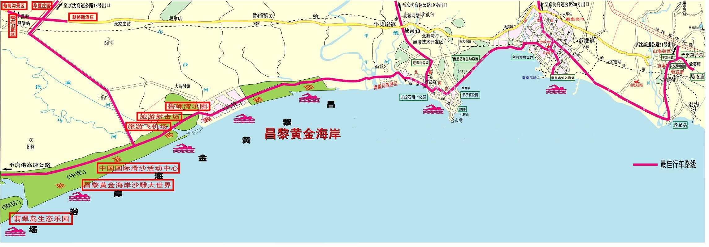 昌黎黃金海岸有52公里長的海岸線,距著名的避暑勝地北戴河僅15公里,但與北戴河不同的是,這里幾乎無石可言,卻有著只有在戈壁灘和黃海故道才能領略的沙漠風光。沿著海岸連綿起伏的一道道新月形沙丘,蜿蜒成一條長達上百里的“金龍”,處處金光閃閃,令人賞心悅目。緊傍這“金龍”的是由近8萬畝防風固沙的林木組成的林帶,黃綠交織,把蔚藍的大海映襯得撲朔迷離,金碧輝煌。