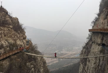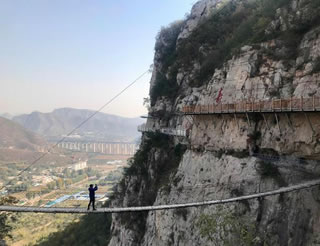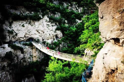 佛爺洞與七星洞有一峽谷相隔,景區(qū)開發(fā)者便凌空架起一道35米開的鐵索橋,把天塹變?yōu)橥ㄍ臼箖啥聪噙B,人踏鐵索橋一步九顫蕩悠悠,頓生“大渡橋橫鐵索寒”之感。不過,這里的鐵索橋絕對安全,被人譽(yù)為“冀南一絕有驚無險”是游人獵奇探險鍛煉意志和膽量的絕佳場所。