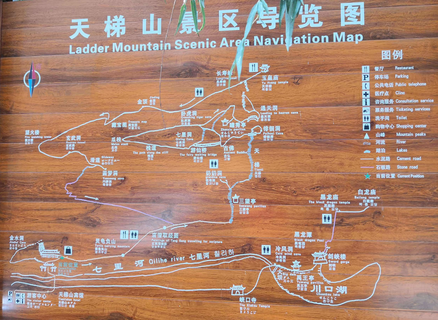 天梯山主峰長壽峰,俗稱金頂,垂直拔高550米,是觀日出的好地方。金頂上金石、玉石、雨花石儲量豐富,美麗的民間傳說為其增添了神奇的色彩。金頂一側(cè)裸露的巨石上鑲嵌一張藏寶圖,石紋盤結(jié)宛若天書,意象鮮明引人注目,猛一看雜亂無章,細(xì)觀瞧神工杰作,口碑流傳:“南坡至北坡,金子一大鍋,誰能解開謎,便是得寶者!”游客到此無不躍躍欲試,試圖解開“藏寶圖”之謎發(fā)一筆大財。