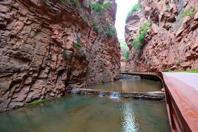峽長(zhǎng)4000米,一般寬1到2米,最窄處只有十幾厘米,壁高150米,這里紅巖絕壁,險(xiǎn)峰對(duì)峙,黃巢曾在此聚兵起義,抬頭仰望,青天一線,俯視腳下,水流不斷,相隔不遠(yuǎn)便有一道瀑布,溪水清澈見底,清涼透骨。