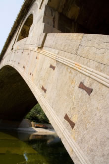 在主券上均勻沿橋?qū)挿较蛟O(shè)置5個(gè)鐵拉桿,穿過(guò)28道拱券,每個(gè)拉桿的兩端有半圓形桿頭露在石外,以?shī)A住28道拱券,增強(qiáng)其橫向聯(lián)系;4個(gè)小拱上也各有一根鐵拉桿起同樣作用。