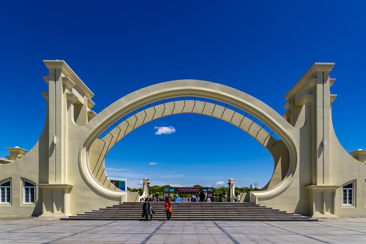 太陽島大門即太陽之門,坐落在太陽島西部主入口處。太陽門全長68米,兩端向太陽石方向環(huán)抱,主門高12.03米。大門為一大四小五個橢圓拱型門相連組成,其造型以新藝術運動風格的建筑語言為主,并揉以其他風格的藝術語言,其創(chuàng)意主題為“太陽的窗口”。中間的拱型大門和太陽島巨石在同一中軸線上,行進方向為正東正西,由此可以面向日出日落,四座小拱門中矗立著四座雕塑。門前的巨石,坐落在光輝四射的太陽圖案中心,腳下是模擬的哈爾濱市街區(qū)圖。