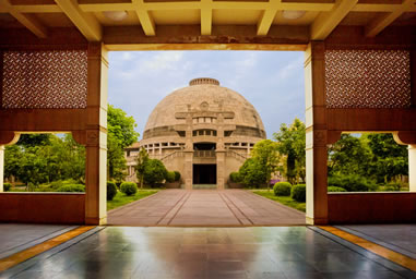 印度佛殿苑方正嚴謹,中心是一個巨大的覆缽式穹窿頂,佛殿下水流往來,噴涌不斷;佛殿外回廊環(huán)繞,靜謐整齊。一座具有印度古典風格的佛教建筑,與中國傳統(tǒng)的佛教寺院并立,她是中印兩國人民世代友好的象征。