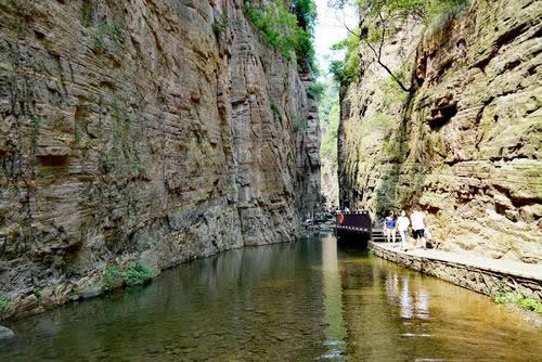 龍?zhí)洞髰{谷景區(qū)是王屋山——黛眉山世界地質(zhì)公園的核心景區(qū),是一條以典型的紅巖嶂谷群地質(zhì)地貌景觀為主的峽谷景區(qū)。谷內(nèi)關(guān)峽相望,潭瀑聯(lián)珠,壁立萬(wàn)仞,峽秀谷幽,經(jīng)過(guò)十二億年的地質(zhì)沉積和260萬(wàn)年的水流切割旋蝕所形成的高峽甕谷、山崩地裂奇觀,堪稱世界一絕,人間少有,享有“中國(guó)嶂谷第一峽”、“古海洋天然博物館”、“峽谷絕品”和“黃河水畫(huà)廊”等美名。