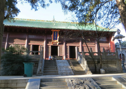 經(jīng)甬道過碑林后便是天王殿,天王殿位于碑林的盡頭,以供奉象征“風(fēng)、調(diào)、雨、順”的四大天王而得名。該殿紅墻綠瓦,斗拱彩繪,門內(nèi)隔屏前左右各有一尊金剛塑像。三間重檐歇山頂?shù)钐,外面有兩大金剛,?nèi)里則是四大天王像,威武雄壯。