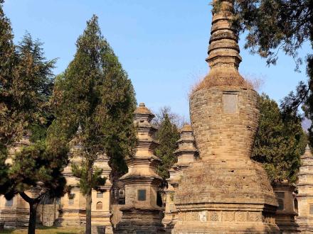 少林寺塔林位于少林寺西300米處,占地面積14000余平方米,是中國(guó)現(xiàn)存規(guī)模最大、數(shù)量最多的古塔建筑群,F(xiàn)存有唐、五代、宋、金、元、明、清7個(gè)朝代的磚石墓塔241座。因塔累繁多,大小參差、高低不同,粗細(xì)不一,形狀各異,排列散亂,看似茂林,故被稱(chēng)為“塔林”,少林寺塔林集古代磚石建筑、雕刻、書(shū)法、繪畫(huà)藝術(shù)之大成,被專(zhuān)家學(xué)者譽(yù)為是“古塔藝術(shù)博物館”。