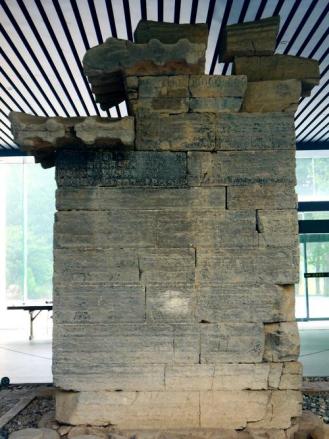 觀星臺(tái)南側(cè)的周公測(cè)景臺(tái)是古代祖先測(cè)量日影、驗(yàn)證時(shí)令季節(jié)的儀器。分臺(tái)座和臺(tái)柱兩部分,臺(tái)座叫圭,臺(tái)柱叫表。夏至日這一天的正午,在測(cè)景臺(tái)的周?chē)床坏奖淼挠白,所以,稱(chēng)此臺(tái)為無(wú)影臺(tái)。又因?yàn)闊o(wú)影,我們的祖先就認(rèn)為這里就是地中。