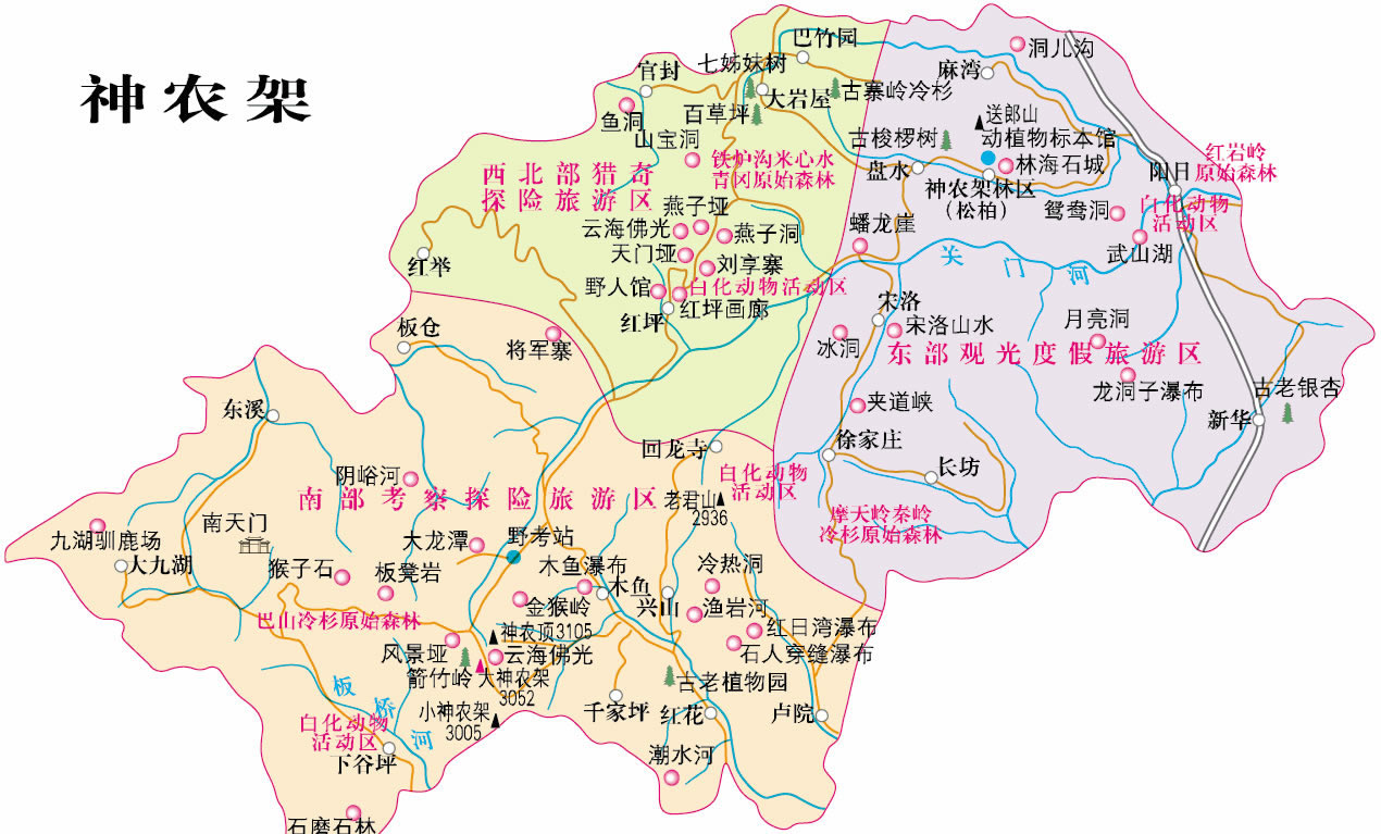 神農(nóng)架是我國內(nèi)陸保存完好的唯一一片綠洲和世界中緯度地區(qū)唯一的一塊綠色寶地。它所擁有的在當(dāng)今世界中緯度地區(qū)唯一保持完好的亞熱帶森林生態(tài)系統(tǒng),是最富特色的壟斷性的世界級旅游資源,動植物區(qū)系成分豐富多彩,古老、特有而且珍稀。蒼勁挺拔的冷杉、古樸郁香的巖柏、雍容華貴的梭羅、風(fēng)度翩翩的珙桐、獨(dú)占一方的鐵堅(jiān)杉,枝繁葉茂,遮天蔽日;金絲猴、白熊、蘇門羚、大鯢以及白鸛、白鶴、金雕等走獸飛禽出沒草叢,翔天林間。一切是那樣地和諧寧靜,自在安詳。這里還有著優(yōu)美而古老的傳說和古樸而神秘的民風(fēng)民俗,人與自然其同構(gòu)成我國內(nèi)地的高山原始生態(tài)文化圈。神農(nóng)氏嘗草采藥的傳說、“野人”之謎、漢民族神話史詩《黑暗傳》、川鄂古鹽道、土家婚俗、山鄉(xiāng)情韻都具有令人神往的誘惑力。這里山峰瑰麗,清泉甘冽,風(fēng)景絕妙。神農(nóng)頂雄踞“華中第一峰”,風(fēng)景埡名躋“神農(nóng)第一景”;紅坪峽谷、關(guān)門河峽谷、夾道河峽谷、野馬河峽谷雄偉壯觀;陰峪河、沿渡河、香溪河、大九湖風(fēng)光綺麗;萬燕棲息的燕子洞、時冷時熱的冷熱洞、盛夏冰封的冰洞、一天三潮的潮水洞、雷響出魚的錢魚洞令人叫絕;流泉飛瀑、云海佛光皆為大觀。